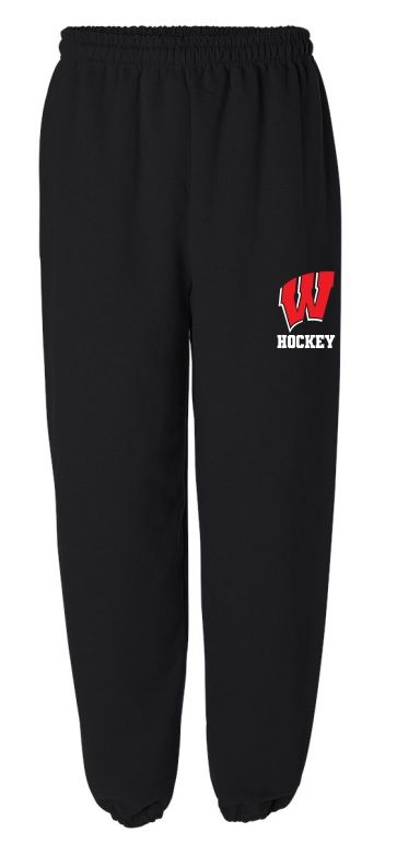 Black Gildan Heavy Blend Sweatpants with a Heat Pressed W Hockey Logo as Shown, on Left Hip. Name options available on the back of right leg for an additional $5.