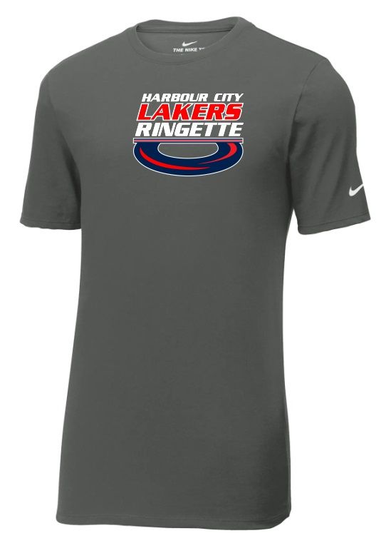 Anthracite Nike Dri-FITCotton/Poly Tee with a Heat Pressed Harbour City Lakers Ringette Ring Logo as shown, Full Chest. Name option is available on the right sleeve for an additional $5.