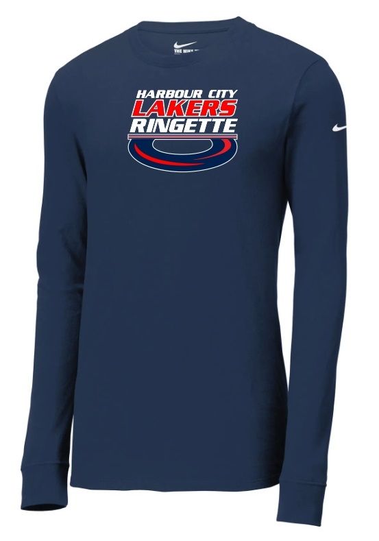 Navy Nike Dri-FITCotton/Poly Long Sleeve Tee with a Heat Pressed Harbour City Lakers Ringette Ring Logo as shown, Full Chest. Name option is available on the right sleeve for an additional $5.