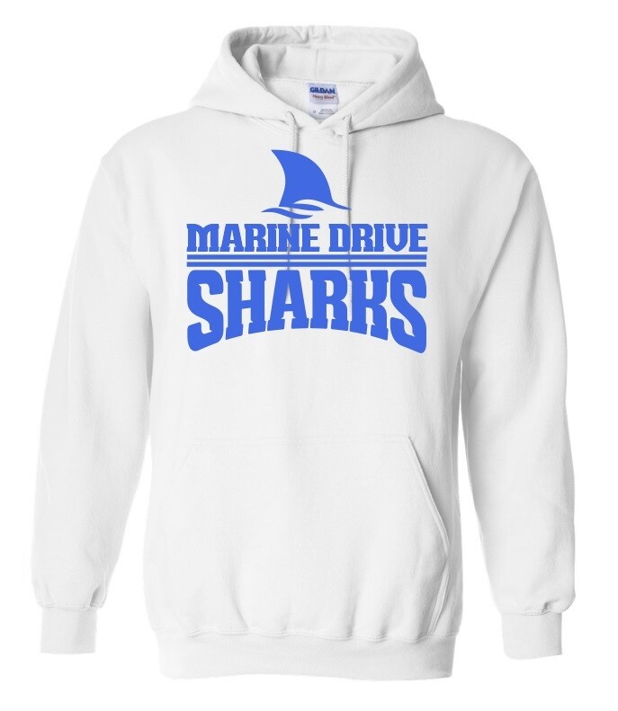 White Gildan Heavy Blend Hoodie with a Heat Pressed Marine Drive Sharks Logo as shown, Full Chest. Name option available on the left sleeve for an additional $5.