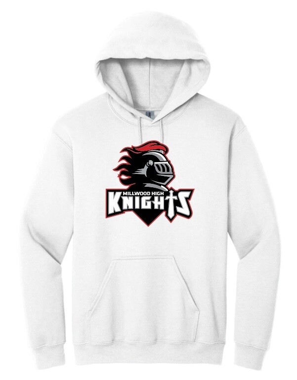 White Gildan Heavy Blend Hoodie with a Heat Pressed Millwood High Logo as Shown, Full Chest. Name option available on the left sleeve for an additional $5.